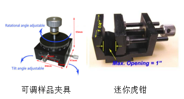 | 5、夾具 | ·可調(diào)二位夾具:水平方向旋轉(zhuǎn)360°,垂直方向±15° ·并配有迷你虎鉗,可安裝在二維夾具上 | ![]() |