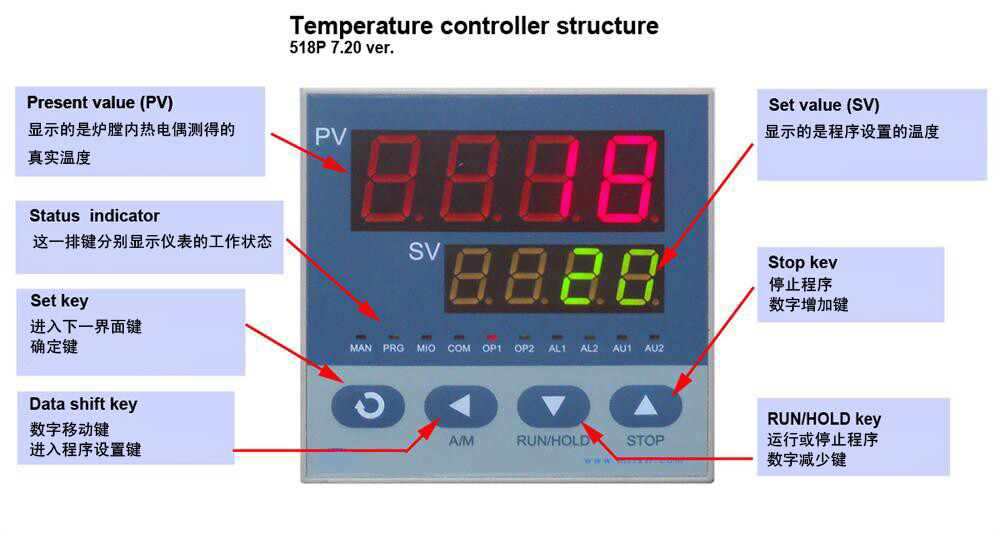 控溫方式 | 采用宇電程序控溫儀表(標配) 1、50段程序控溫智能PID調(diào)節(jié)。 2、具有過溫保護 斷偶保護過溫或斷偶時電爐加熱電路自動切斷,,(當電爐溫度超過1520度或熱電偶燒斷時,主電路上的交流繼電器會自動斷開,主電路斷開,面板上ON燈熄滅,OFF燈亮,有限的保護電爐)。 3、帶有485 通訊接口(選購軟件時標配) 4、具有斷電保護功能,即斷電后再給電啟動爐子時、程序不是從起始溫度開始升、而是從斷電時爐溫開始升。 5、儀表具有溫度自整定的功能
