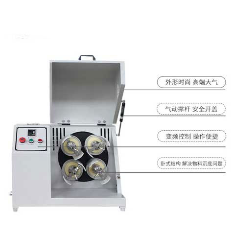 臥式行星式球磨機(jī)是在豎直的行星盤上對稱裝有四個臥式安裝的球磨罐。球磨罐在行星運(yùn)動時沒有固定的平面底,在研磨物料的過程中,罐內(nèi)磨球在受公轉(zhuǎn)和自轉(zhuǎn)兩個離心力的同時,受到自身重力的影響,有助于加強(qiáng)磨球及物料無序化運(yùn)動程度,提升研磨效果和研磨效率。由于球磨罐旋轉(zhuǎn)時沒有固定平面底,能較好解決部分物料沉底問題。臥式行星球磨機(jī)結(jié)構(gòu)簡單、操作便捷,適用于實驗室小批量樣品實驗研究。