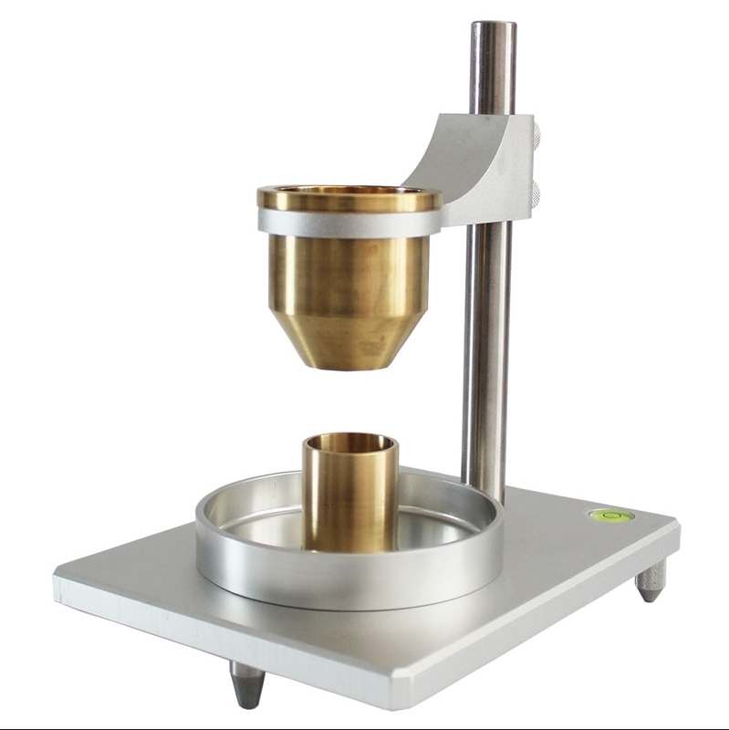 5、支架和底座:支架用于固定漏斗。底座必須水平、穩(wěn)固,不得振動(dòng),供安裝支架和杯子使用.漏斗小孔底部和杯子上部之間的距離為25mm,可用定位塊來(lái)調(diào)節(jié),漏斗和杯子必須同心。